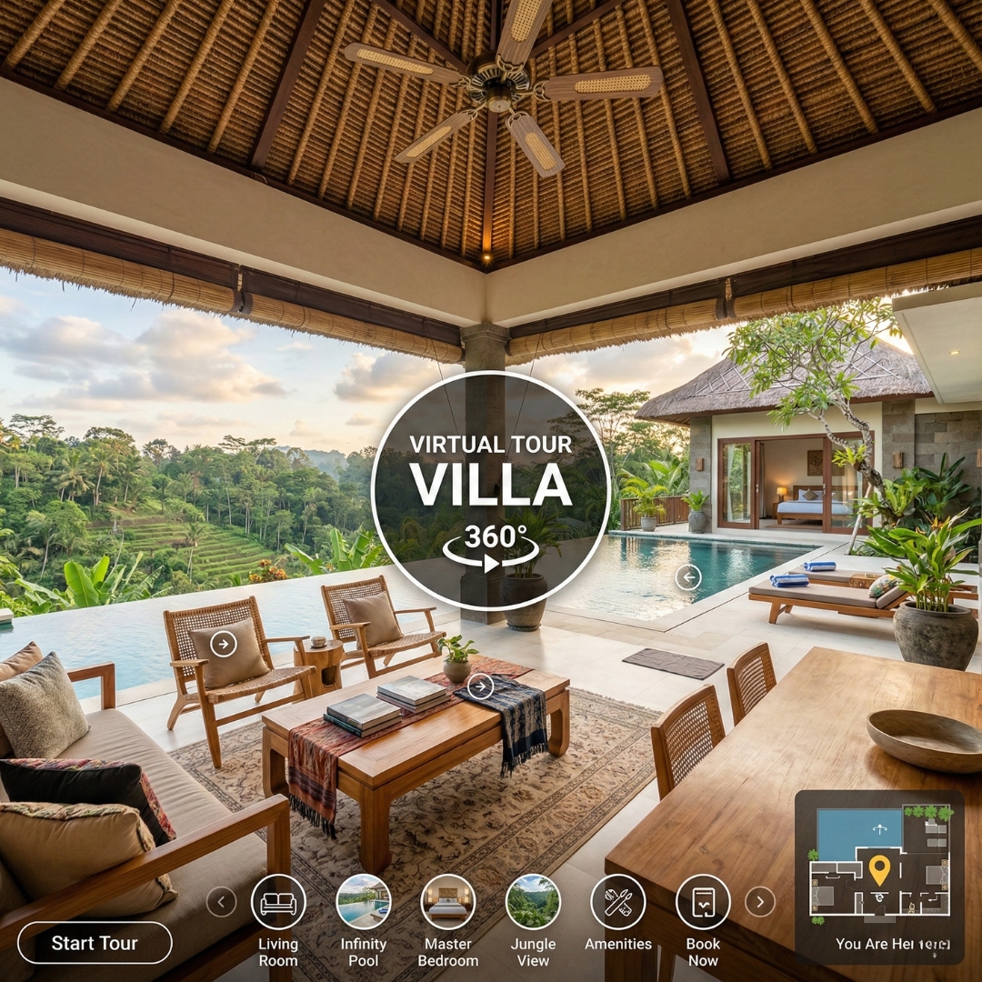 Virtual tour 360°/3D meningkatkan engagement listing vila dan membantu menyeleksi prospek berkualitas.