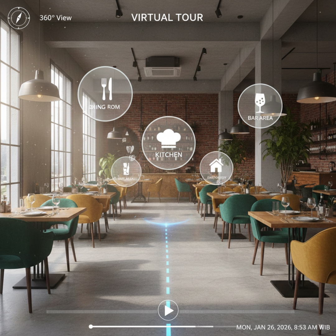 Virtual tour 360 memfasilitasi keputusan pelanggan dengan memperlihatkan interior, private dining, dan layout event. Selain itu, listing yang menyertakan tour cenderung tampil lebih lengkap pada profil bisnis online; Google Business merekomendasikan penggunaan foto 360 dan tour untuk memperkaya listing dan pengalaman calon pelanggan. Untuk klaim metrik spesifik terkait uplift konversi, gunakan studi kasus vendor atau data internal karena variasi antar pasar dapat besar (tanpa sumber tepercaya).